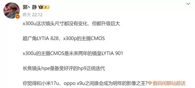 据报道,vivo X300 Ultra的超广角镜头将搭载5000万像素的LYTIA 828传感器,这颗传感器拥有1/1.28英寸的大底。