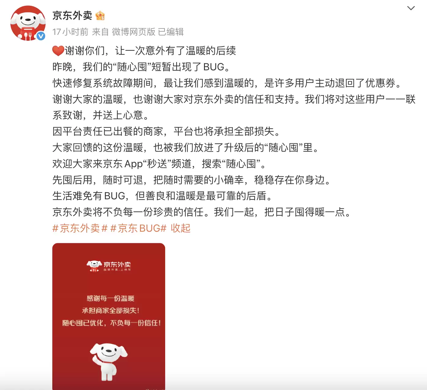 12月9日,京东方面对此作出回应,称“随心囤”功能因系统故障出现短暂异常。在技术人员紧急修复期间,不少用户主动退还了优惠券。京东表示将联系这些用户表达感谢,并会送上小礼物作为心意。对于因平台责任已出餐的商家,平台也会承担全部损失。