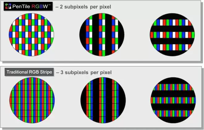 这是因为红、绿、蓝三色的子像素寿命不同,假如不使用这种方案,寿命最短的蓝色子像素会比红、绿子像素更快出现衰减,影响屏幕的显示效果。虽然经过数年时间的优化,Pentile钻石排列或类钻石排列已经解决了大部分问题,但仍存在文字边缘发虚等细节问题。