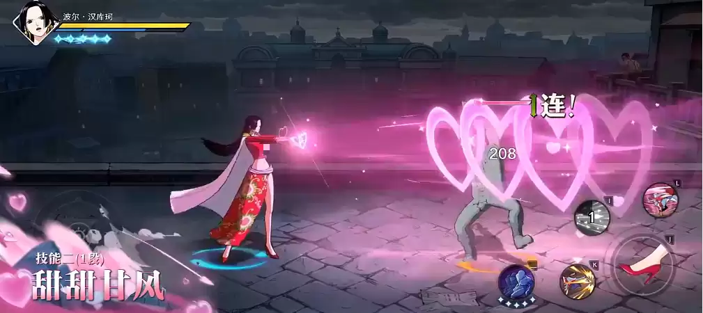 一技能“飞燕踢”支持点按与长按两种释放模式。点按时分为三段:首段为直线飞踹,二段为斜上方旋转踢击,三段为空中高弹腿下劈,具备抓取判定;长按则会激活果实能力融合机制,消耗额外精力值,全面提升各段攻击性能。