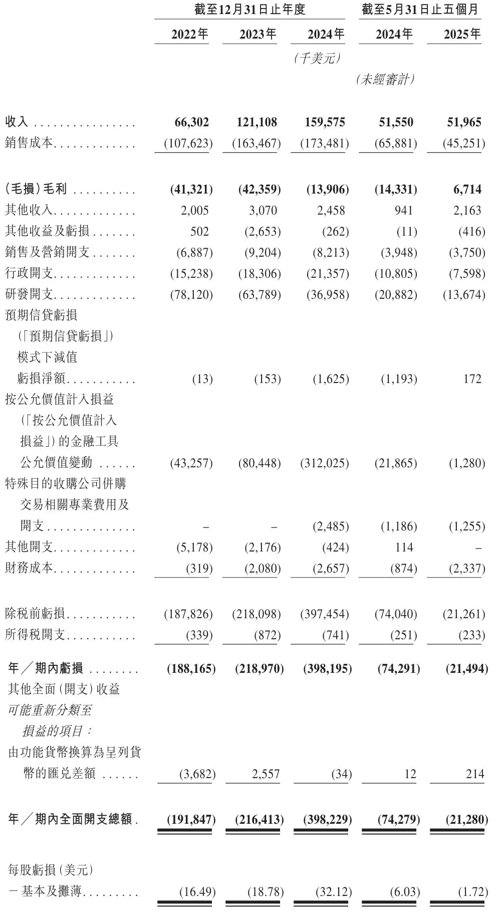 招股书显示,图达通在2022年、2023年及2024年的营收分别为6630万美元、1.21亿美元及1.6亿美元;同期净亏损分别为1.88亿美元、2.18亿美元及3.98亿美元。而2025年前五个月,公司营收达到5196万美元(约合人民币3.67亿元),期内净亏损为2149万美元(约合人民币1.52亿元)。