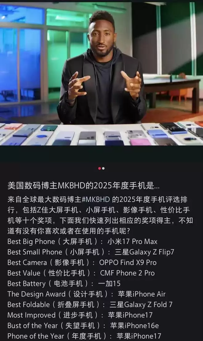 就在不久前,他对2025年发布的众多新机进行了一轮全面盘点,并评选出了十项大奖。其中,小米17 Pro Max被评为年度最佳大屏手机(6.9英寸),三星Galaxy Z Flip7荣获年度最佳小屏手机称号,OPPO Find X9 Pro则拿下了年度最佳影像手机。CMF Phone 2 Pro成为年度最具性价比手机,一加15是年度最佳续航手机,iPhone Air凭借设计斩获年度最佳设计手机,三星Galaxy Z Fold7则是年度最佳折叠屏手机。此外,年度进步最快手机颁给了iPhone 17,而年度最令人失望手机则是iPhone 16e。有意思的是,年度最佳手机的桂冠同样由iPhone 17摘得。