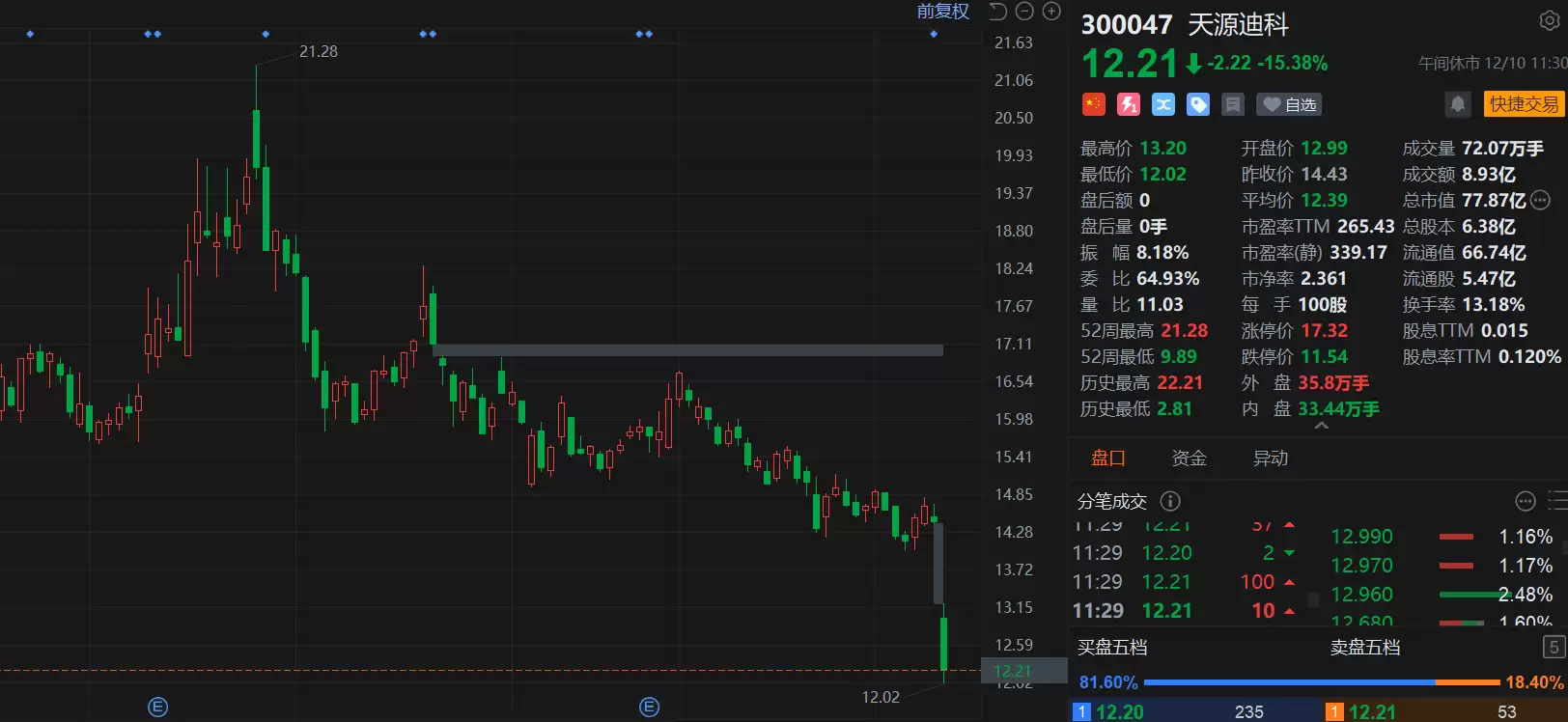 天源迪科(300047.SZ)股价大幅跳水,盘中一度暴跌超过15%,领跌两市。股价最低下探至12.02元,刷新历史低位,公司总市值缩水至77.87亿元。