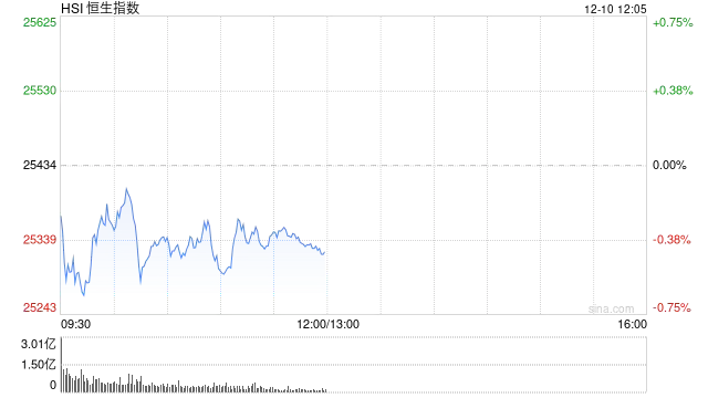 12月10日,港股三大指数全线走低。截至午间收盘,恒生指数下跌0.43%,报25324.75点;恒生科技指数回落0.68%;国企指数下滑0.51%。盘面上,科技股表现分化,网易、哔哩哔哩跌幅超过1%,腾讯下挫1%,美团则逆市上涨超1%。黄金板块普遍上扬,灵宝黄金大涨超过10%;光伏太阳能股走势疲软,协鑫科技跌超3%;中资券商股高开低走,招商证券跌幅超过3%。此外,今日两只新股上市,图达通上涨34%,宝济药业飙升125%。