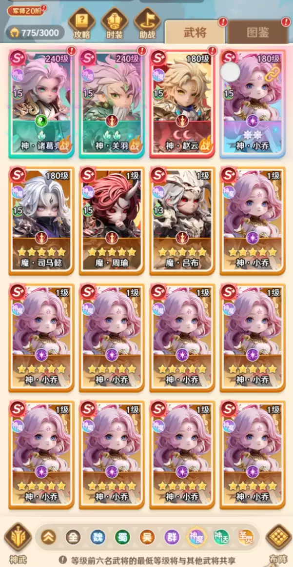 其实在《巨神军师》游戏当中,还有一个强度更高的神魔混搭阵容。这个阵容相对而言比较强悍,也具备一定的全能性。这里推荐的武将是关羽、吕布、诸葛亮、小乔、貂蝉和吕玲绮。这些角色直接搭配在一起,能形成极强的爆发体系。例如魔化吕布的伤害比普通吕布高出许多,关羽依然负责收割,这样就能构成双核爆发的体系。诸葛亮能够提供怒气值,小乔和貂蝉可以强化控制与护盾的容错率。