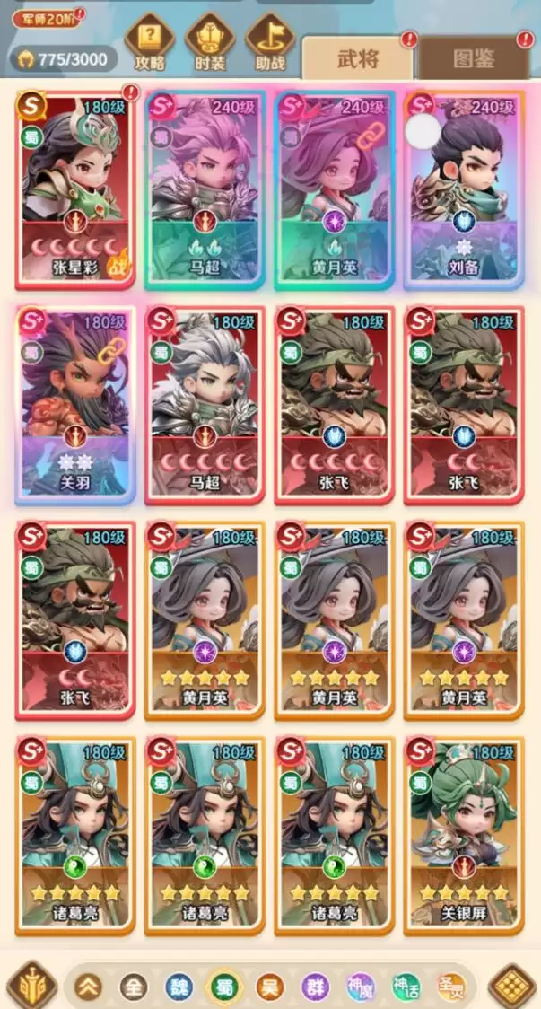 接下来要介绍的是蜀国阵容。在游戏中总共涉及到四大阵营,蜀国阵容便是其中之一。他们能够实现追击秒杀,还能进行残血收割。例如这里推荐的核心武将是关羽、赵云、诸葛亮、黄月英、张飞、刘备。目前这个阵容比较适合PVP模式的快速击杀,在PVE推图方面也能负责高效收割。