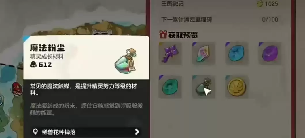 王国城堡附近还有一家精灵道具店。这个位置稍远一点,不过也不难找。从地图上看王国城堡的区域,周边会标注有精灵道具店的图标。这家店同样设置了消费里程奖励,机制和前面两家是一样的。累计消费到了就能领,里面的魔法粉尘数量也够用一阵子。