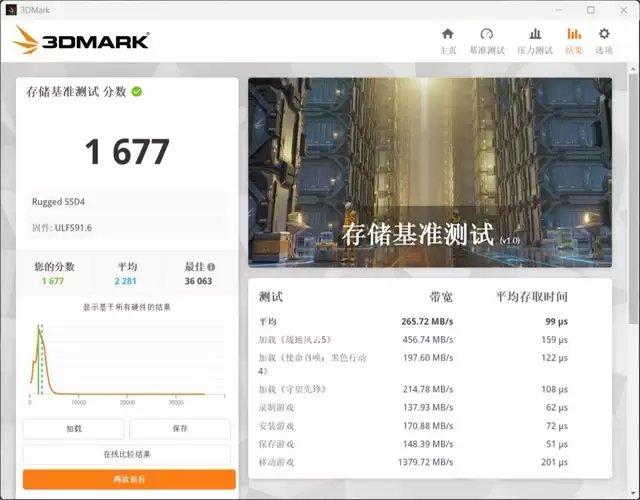 同时,搭载魔霸9 MINI使用3DMARK对雷孜Rugged SSD4进行了游戏测试,这个成绩也是可圈可点。尤其是移动游戏速度达到1379.72MB/s,可以理解为这款便携SSD在应对大容量零散文件长时间拷贝时,可以达到这样的速度成绩,算是很优秀了。