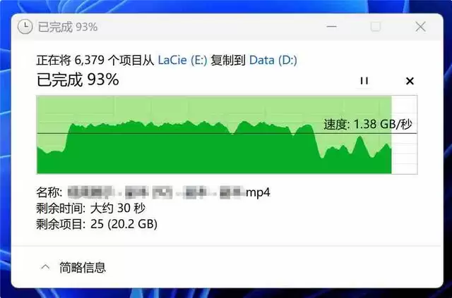 更妙的是,创作并未在此止步。 拍摄完毕,你无需来回倒腾文件,只需将这块硬盘直接连接到你的iPad或电脑上,就可以毫无卡顿地直接剪辑刚刚拍摄的原始素材。得益于高达40Gbps的带宽,导出文件也是相当快速的。在实际测试中,包含6378个拍摄素材的文件从Rugged SSD4转移到电脑D盘,瞬时速度达到1.38GB/s以上。