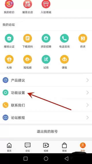 2、在“我的”页面中,找到并选择“功能设置”选项,点击进入。