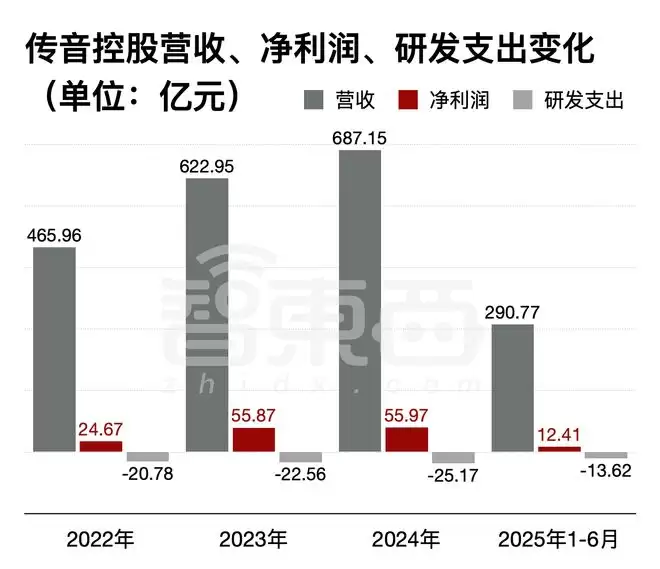 2024年、2024年、2024年、2025年1-6月,传音控股的营收分别为465.96亿元、622.95亿元、687.15亿元、290.77亿元;净利润分别为24.67亿元、55.87亿元、55.97亿元、12.42亿元;研发费用分别为20.78亿元、22.56亿元、25.17亿元、13.62亿元,占总营收比率分别为4.5%、3.6%、3.7%、4.7%。据招股书,2024年至2024年营收的大幅度上升主要是由于其智能手机的收入增加和公司在新兴亚太市场及拉丁美洲的市场扩张。