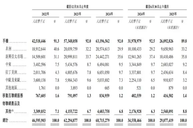 2024年至今年上半年,手机类产品(包括智能手机和功能手机)的营收占比均超过89%,为其主要收入来源,其中,功能手机业务带来的营收占比正在逐年下降。报告期间,传音控股按产品类型划分的收入情况如下: