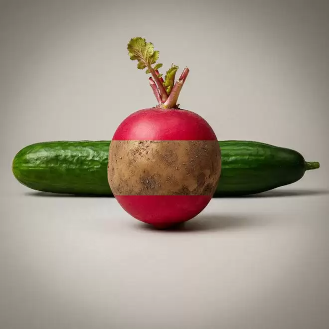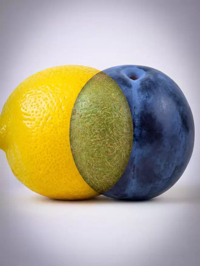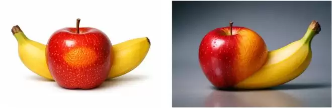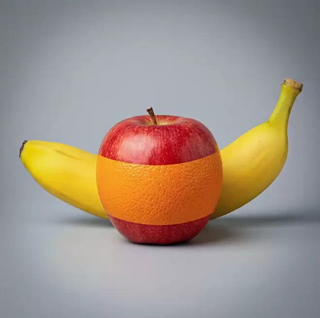 让栗子/榛子生成一个「展示物理色彩理论」的图片,黄色香蕉和苹果前后放置,重叠部分以黄红混合而成的多孔、橙色的表皮。