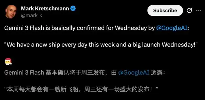 除了GPT-5.2,还有Gemini 3 Flash也即将发布。