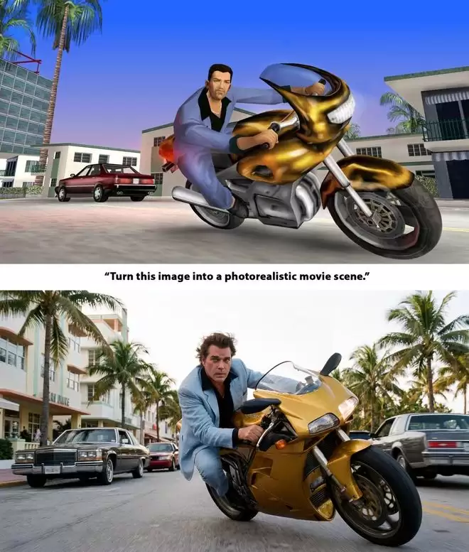 它可以把GTA游戏画面,直接转化成真实的电影质感的图片。