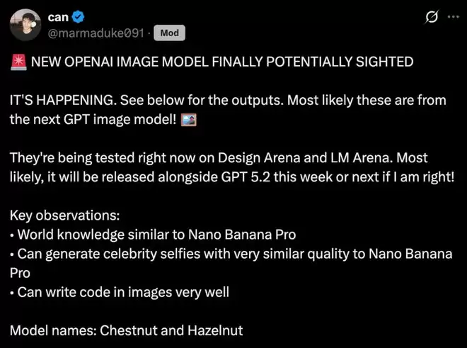 这两款模型,据称是GPT Image 2。有网友猜测,它将随着下一代旗舰模型GPT-5.2于本周亮相。