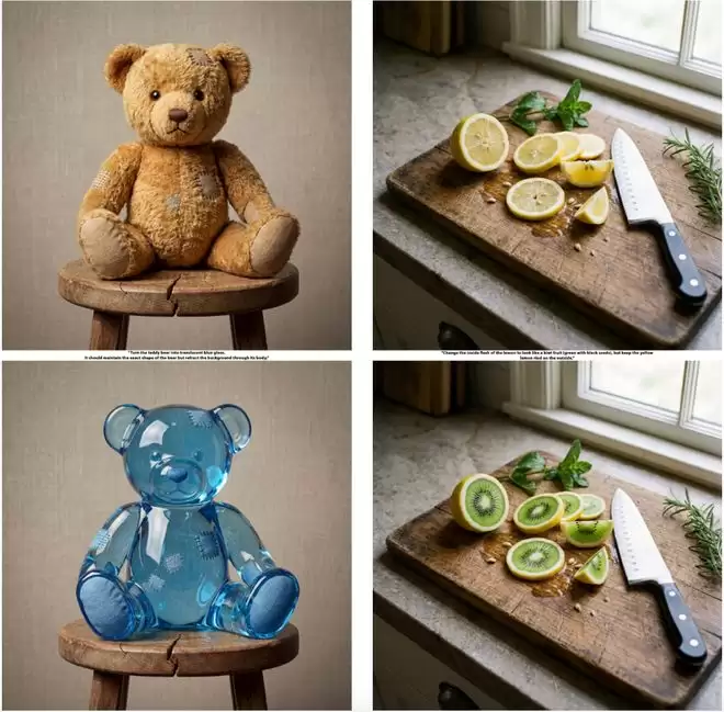 一句话即可编辑图片——把柠檬变成猕猴桃,小熊布偶变成玻璃熊。