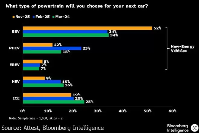 彭博调查:中国近半数首次购车者考虑新能源汽车