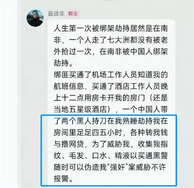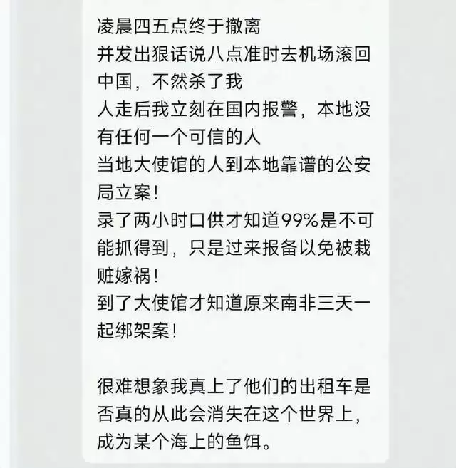 “后来在洗手间洗了个脸,一个大老爷们情绪失控大哭大喊,压力真的太大了,一天一夜没睡觉,被劫完不敢跑出酒店怕二次劫持,酒店工作人员无一可信,在酒店一直顶住门到早上七点半大使馆的安保来了,才敢走出酒店到安全屋。”
