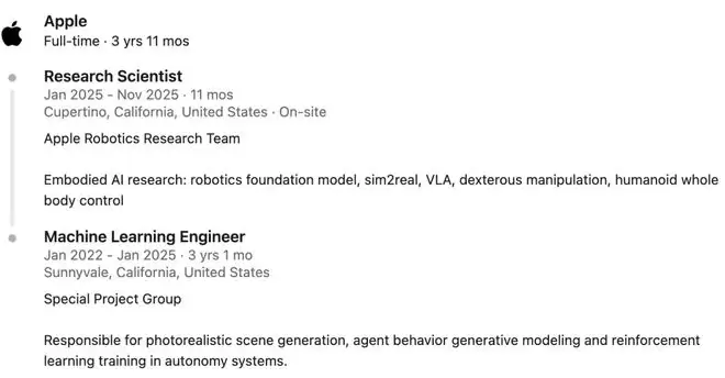 据公开资料显示,年初,他加入了苹果机器人学研究团队,从事具身智能研究,包括机器人学基础模型、sim2real、VLA等方向。
