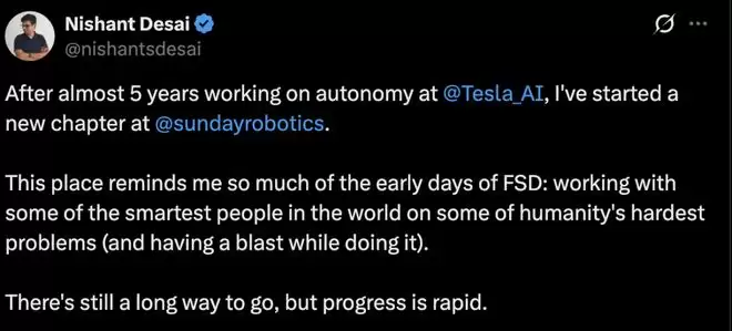 上个月20日,特斯拉任职5年的自动化工程师Nishant Desai也加入此初创。