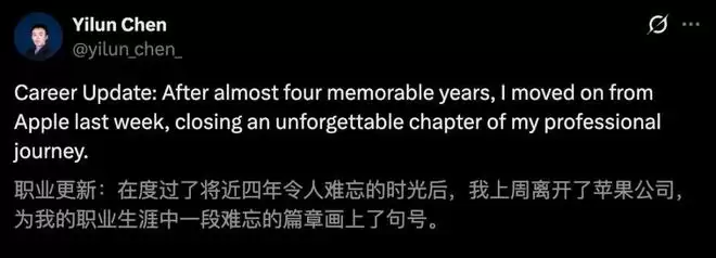 Yilun Chen于上周正式离职,为在Apple的精彩旅程画上句号。