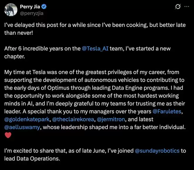 Perry Jia上周宣布,他已在今年夏天离开特斯拉,加入这家新创公司。他曾在特斯拉的Autopilot与Optimus项目中工作了近六年。