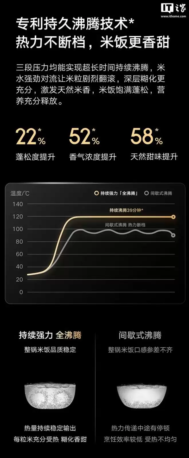 据介绍,这款电饭煲可根据不同食材特性,匹配 1.0、1.2、2.0 倍压力,改变锅内温度和米饭糊化状态,定制软硬口感。电饭煲还拥有专利持久沸腾技术,可提升米饭香气、蓬松度,针对东北米、泰国香米、丝苗米等主流米种建立了 3000 + 煮米方案数据库,智能调节火力、时长,号称“不挑米都好吃”。