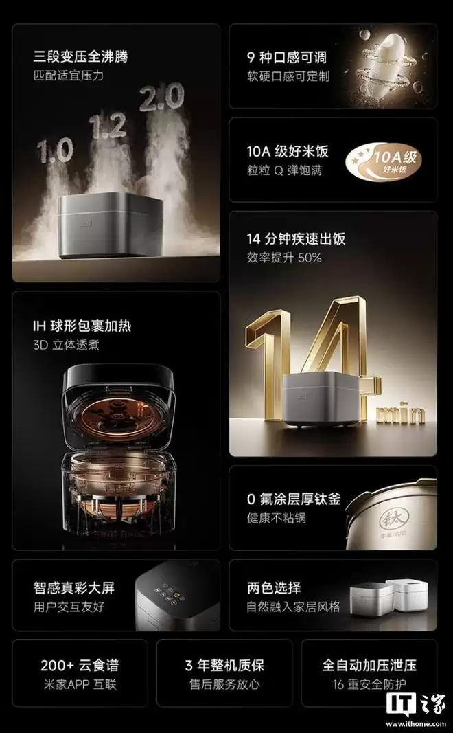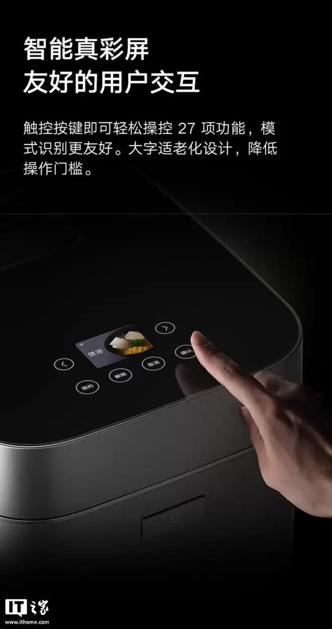 IT之家了解到,这款电饭煲支持米家 App 远程操控,自带一块彩色屏幕,触控按键即可操控 27 项功能,内置压力电子锁,省去麻烦的手动上锁、解锁步骤,减少安全风险,支持煮饭、炖肉、煲汤、蒸菜。