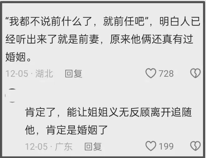 而隐婚的话题,则是因为黄慧颐说了一句“我都不说前什么了,就前任吧”,让网友认为是指两人有过一段婚姻,原本的“前”可能是前妻并非前任,也只有婚姻才会让人义无反顾的放弃所有。