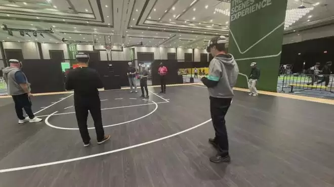展馆中央的 NBA VR 体验区格外引人注目。戴上头显后,你不再是个被固定在座位上观看 360 度全景的观众,而是能以裁判甚至球员的视角,自由观看比赛名场面。更令人惊喜的是,系统还能实时展示投篮难度、防守统计等高端数据分析。