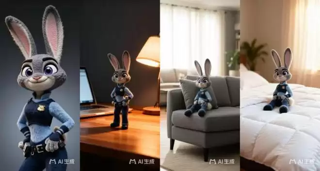 在产品级渲染测试中,朱迪警官玩偶在影棚光、台灯暖光、自然光客厅与床品光照等多个现实场景下的质感表现相对稳定。短绒毛的细节、眼睛的高光反射、沙发布料与玩偶绒毛之间的材质对比都能够被较为准确地表现出来,整体更接近商业产品渲染效果。