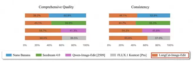 在图像编辑任务的并列对比评估(SBS)中,LongCat-Image-Edit在综合质量与一致性两项关键指标上,对NanoBanana和Qwen-Image-Edit等模型均取得较高胜率。