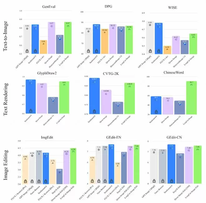 整体来看,LongCat-Image在图像编辑任务上已逼近部分闭源模型水平,在文生图基础能力上也保持在开源头部阵营。
