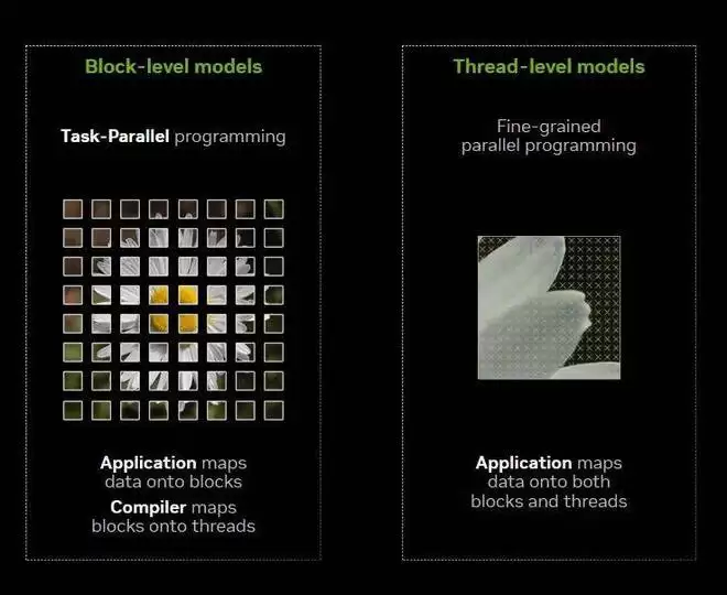 Tile 模型(左)将数据划分为多个块,编译器将其映射到线程。单指令多线程(SIMT)模型(右)将数据同时映射到块和线程