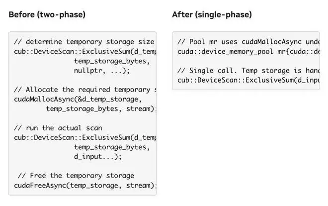 CCCL 3.1 为一些接受内存资源的 CUB 算法添加了新的重载,从而用户可以跳过临时存储查询 / 分配 / 释放模式。