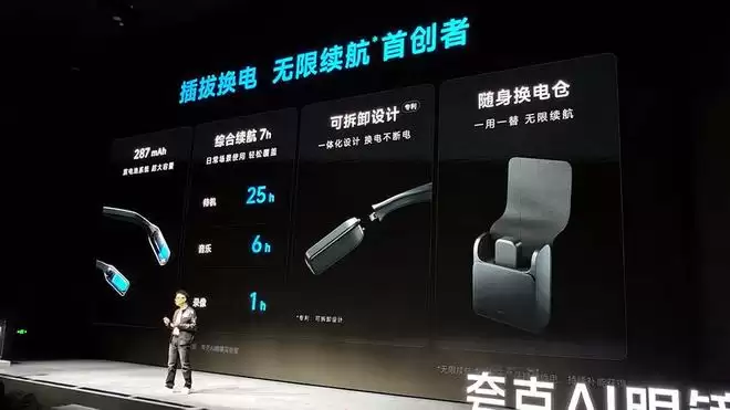 基于双电池系统,夸克AI眼镜支持电池更换,通过热插拔镜腿,用户可以快速更换主电池,据称搭配一个可随身携带的换电仓,可以实现全天候使用。