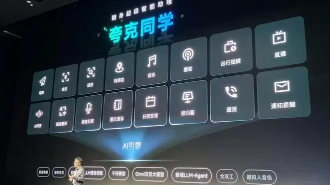 首先是AI语音问答,在收音方面,其采用5个麦克风加 1个骨传导的阵列设计,在恶劣的噪声环境中也能精确唤醒,搭配夸克语音大模型,可以识别口音、方言。