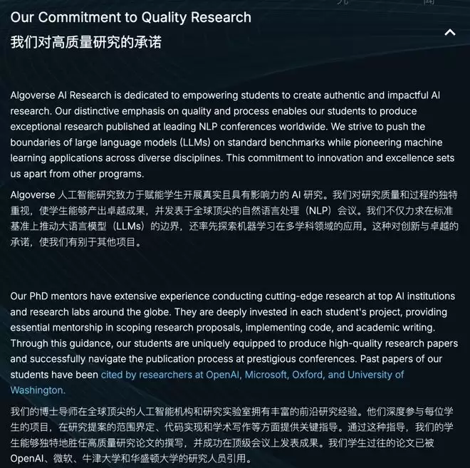 据公开资料显示,Algoverse是一个付费的AI研究项目,主要面向全球本科生、高中生和行业专业人士开放。