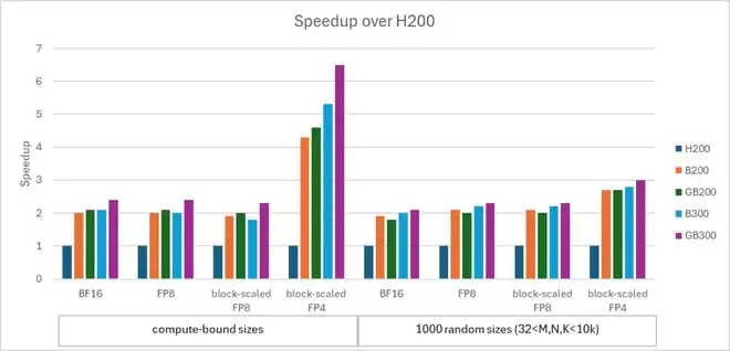 在不同数值精度下,Blackwell GPU相对于H200的加速比