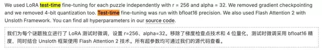 在测试时,团队对每个谜题独立进行了LoRA微调(test-timefine-tuning),参数设为r=256和alpha=32。