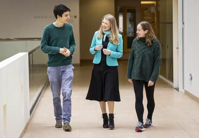 Fedorenko在MIT与博士后研究员Andrea de Varda (左) and Halie Olson (右)