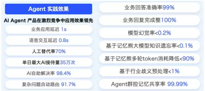 其Agent互动服务平台在激烈竞争压力下,保持了较高的稳定性和服务质量:单日最大AI接待量达到35万次,AI自助解决率达98.4%,人工替代率达70%,复杂问题自动路由率达91.7%,模型幻觉率低于0.2%,业务回答准确率稳定在99%左右。