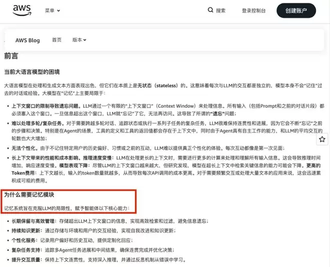 亚马逊云科技在今年的Agent记忆实践文章里也做了类似总结:LLM本质是无状态的,每次调用都是一次新的推理,长上下文不仅不能彻底解决记忆问题,反而会带来性能下降和Token成本攀升,这一点和红熊在项目中的经验总结是高度一致。