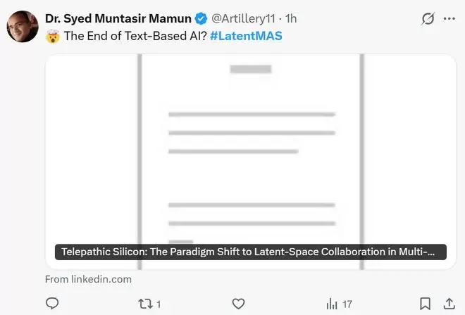 「在传统的多智能体系统中,我们通常让智能体 A 生成文本,再由智能体 B 读取并处理。这种文本瓶颈既浪费算力,又严重稀释语义信息。LatentMAS 带来了一种近乎心灵感应式的替代方案:智能体通过交换潜在思维来协作。