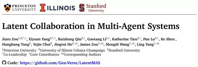 论文标题:Latent Collaboration in Multi-Agent Systems论文地址:https://arxiv.org/pdf/2511.20639GitHub 地址:https://github.com/Gen-Verse/LatentMAS