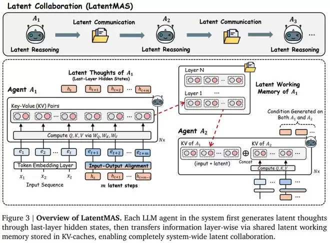 在每个智能体内部,推理通过自回归地生成最后一层隐藏表示来展开,从而无需显式解码即可捕捉模型持续进行的内部思考;在智能体之间,信息通过存储在各层 KV 缓存中的共享潜在工作记忆进行交换,其中包含输入上下文以及新生成的潜在思维内容。