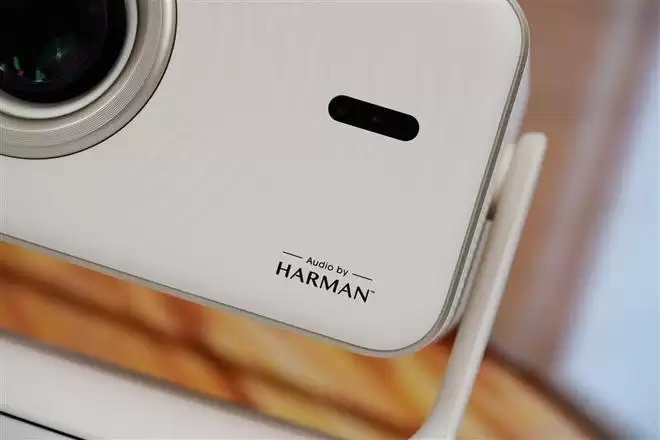 机身右侧的传感器镜头,右下角印有Audio by HARMAN,标明了哈趣H3 Ultra投影仪搭载哈曼的音响系统。