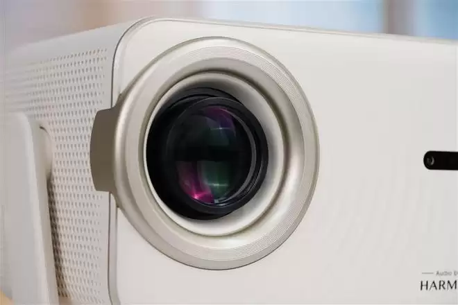哈趣H3 Ultra投影仪的投影镜头特写,可以看到机身前面板上有从镜头发散出来的同心圆波浪纹,非常精致。