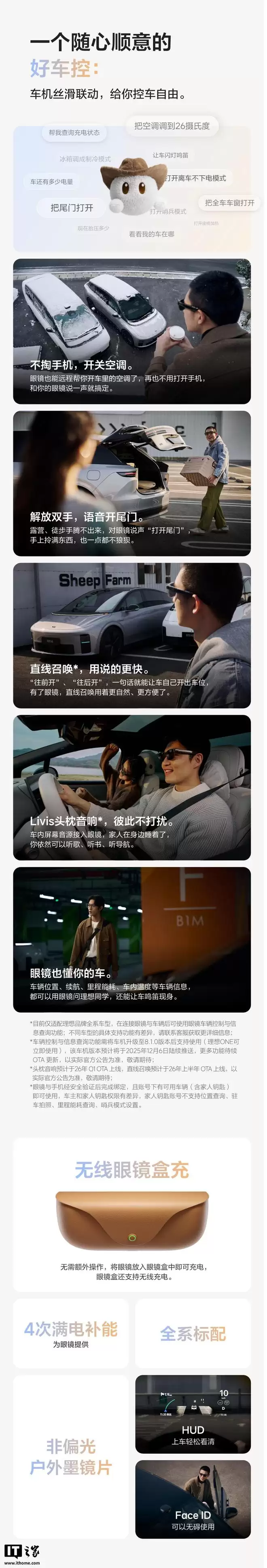 其他方面,这款眼镜配有无线充电眼镜盒,并能与理想汽车的无线充电面板兼容。同时,它支持HUD信息显示和FACE ID解锁功能。